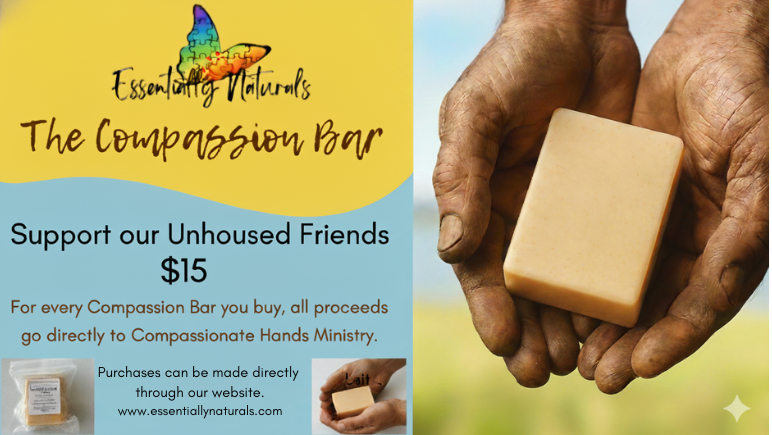 🤝 How it works: For every Compassion Bar you buy, all proceeds go directly to Compassionate Hands Ministry, a local nonprofit providing shelter, meals, transportation, and outreach to our unhoused friends in Wilson County. Your purchase becomes a lifeline—fueling real help and heartfelt connection.
